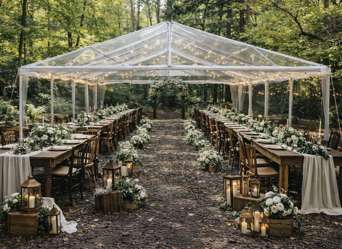 A refined balance of rustic elegance and bridal romance. Champagne tones, soft glow, and candlelit chandeliers woven into the trees create an elevated yet inviting atmosphere. Polished details meet natural wood and forest surroundings, resulting in a celebration that feels luxurious, warm, and effortlessly romantic.